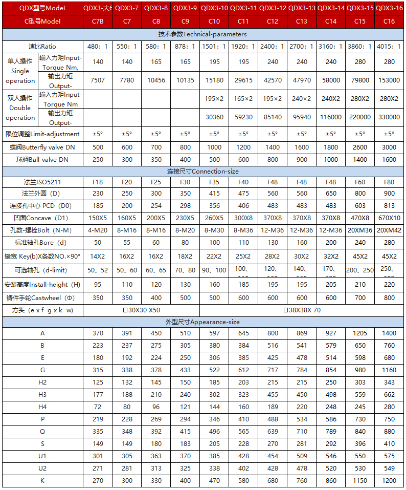 該系列是小蝸輪箱與大蝸輪箱對接組合成為二級傳動蝸輪減速增壓機(jī)構(gòu),提高了機(jī)械總效率,輸入小力矩,開動大閥門,使操作人員省力,每種型號提供多個傳動比,特殊型可輸出360°無限多回轉(zhuǎn),能更好的匹配不同規(guī)格的閥門。